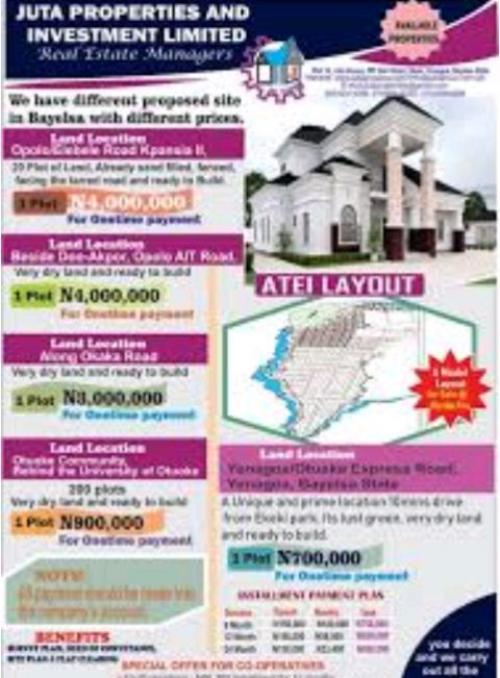 At Juta Property & Investment Limited , we make it our responsibility to help interested members of the public invest in real estate in order to become property owners, live in it or use it to generate additional incomes for themselves and their families. Our properties are always very lucrative due to where they are sited. In the last few years, we have opened large residential estate across Bayelsa State and those estates have all been fully subscribed due to their lucrative nature. Our estates stand out anywhere it is located due to their lavish amenities and very high return on investment. Those who have had the foresight to invest in any of our large estates are happy they did. Our estates are very affordable, safe and well planned and capable of generating quick return on investment. If you have missed out in the previous ones, do well to key in ones that are selling now and if you don't, you will have yourself to blame.